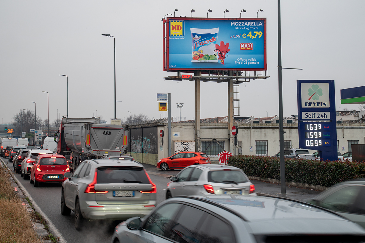 In uscita città: funge da ultimo, memorabile messaggio per chi si dirige ai terminal o verso l’area est di Milano.